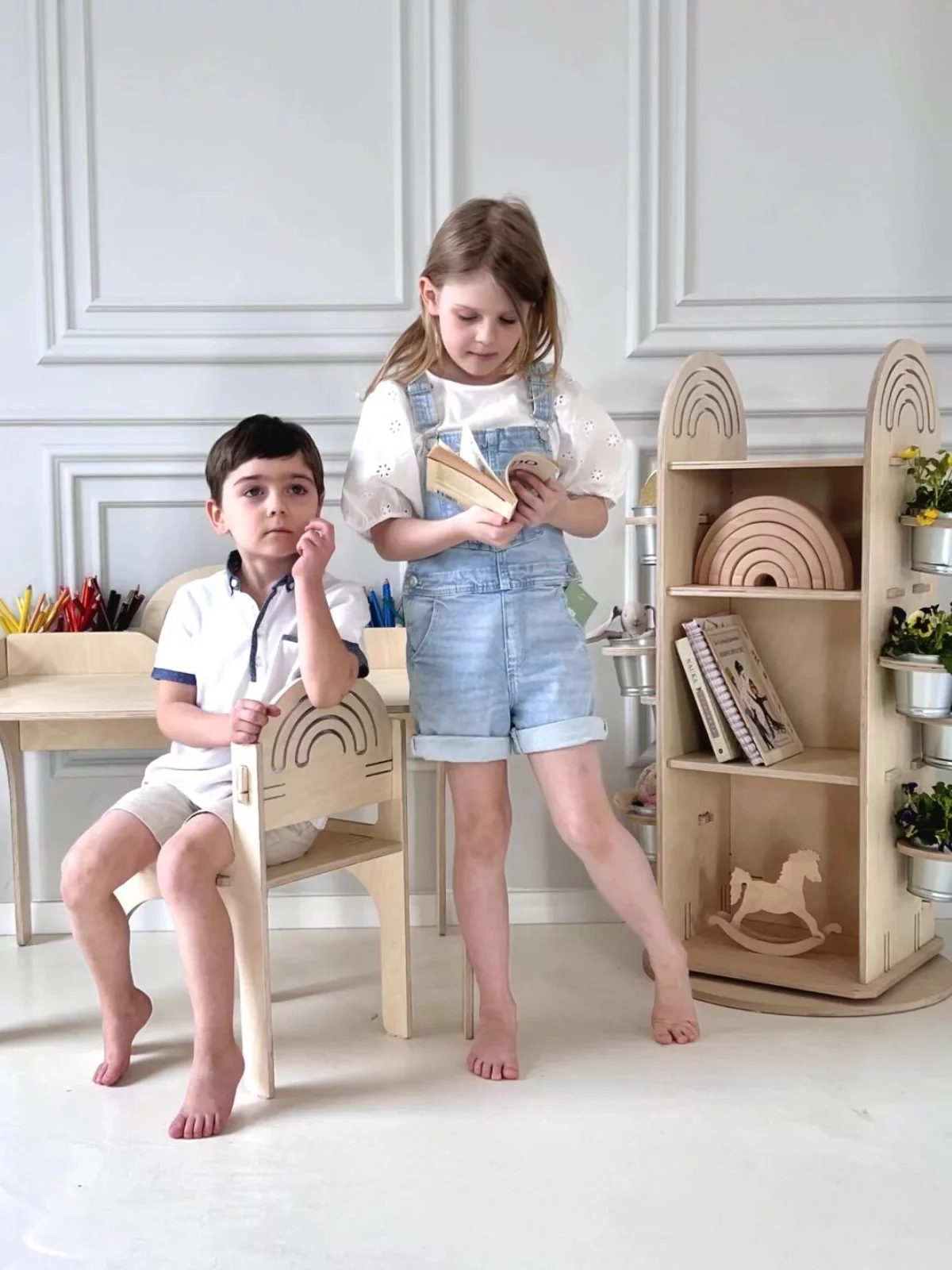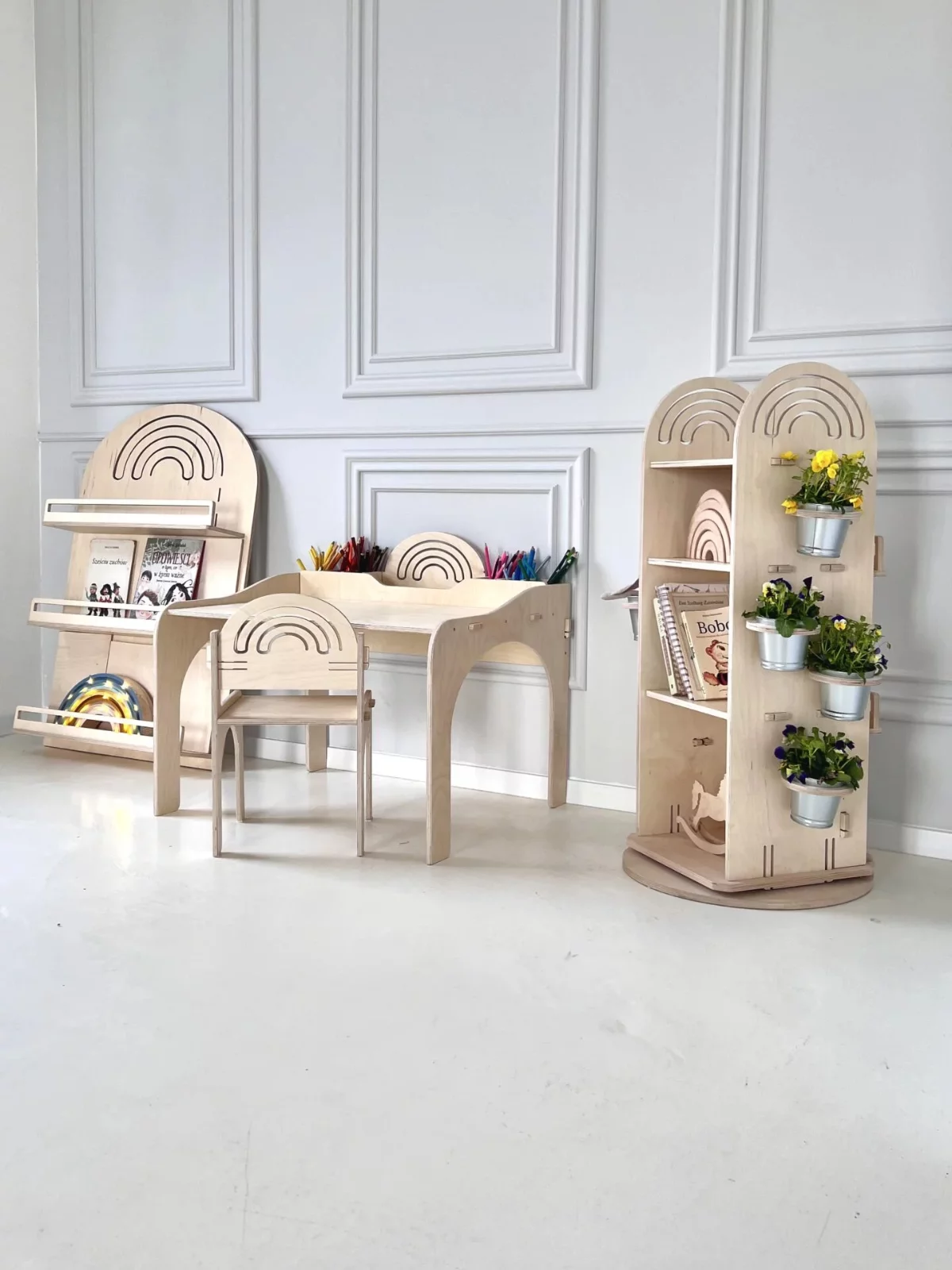 The Rainbow shelf is an ideal proposition for the first bookcase for our child. It is designed in the spirit of Montessori, in such a way as to support the independence of the child. The open form and shallow shelves secured with a strip motivate to keep order. Limited storage space minimizes distractions and enhances your child’s concentration.