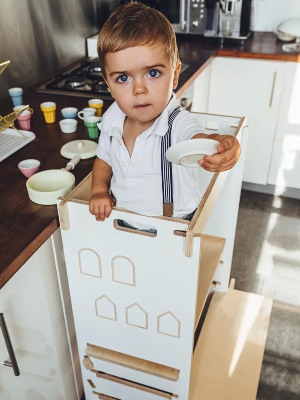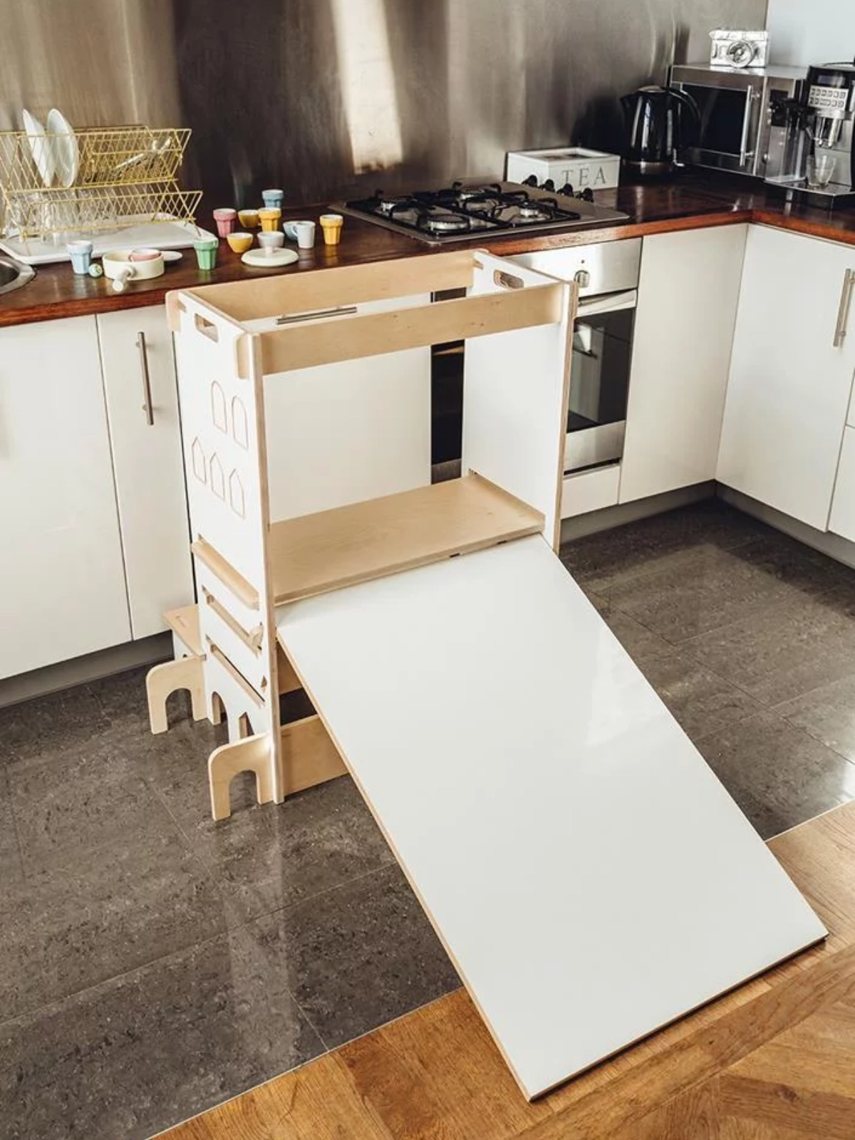 Double Kitchen Helper ist eine Art gesicherter Plattform, auf der das Kind an vielen Küchenaktivitäten teilnehmen kann. Dank dieser Plattform sieht das Kind nicht nur, was auf der Arbeitsplatte passiert. Es kann auch nach verschiedenen Produkten greifen und sich an der Zubereitung von Mahlzeiten versuchen. Das Möbelstück bietet auch die Funktion einer Rutsche und eines Theaters.