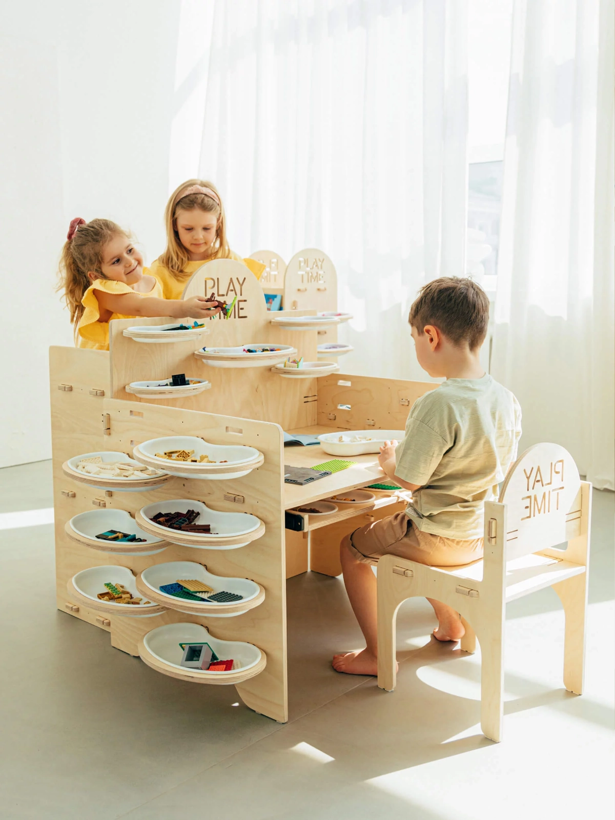 The Play Time children’s chair is a set together with the Play Time desk. What they have in common, is an integral design and manufacturing method. Such a set will make a place for creative activities, crazy experiments or quiet study more attractive. The Play Time children’s chair and desk are only part of the collection. Other furniture from the Play Time collection is a 360 rotating bookcase and a cabinet with three shelves.