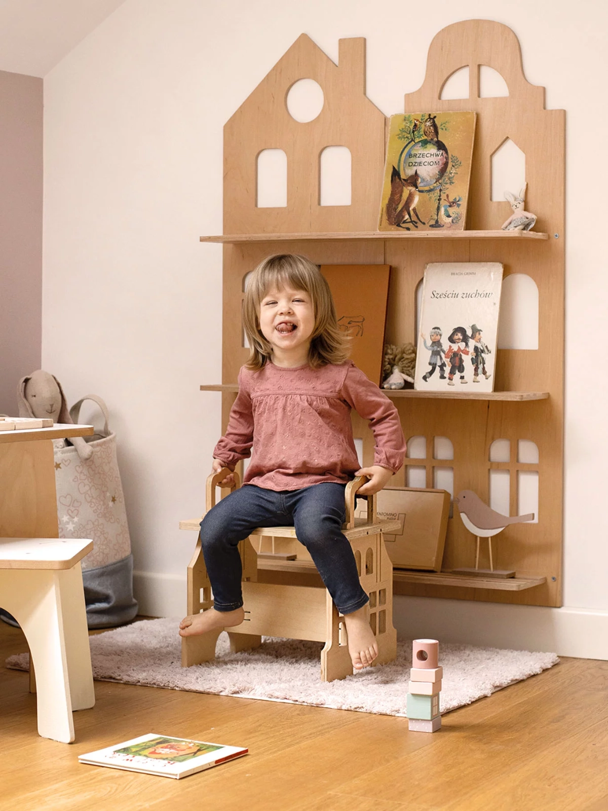 Dieser Kindersitz ist jedoch nicht gewöhnlich. Diese kleine Plattform ist gleichzeitig eine originelle Verbindung eines Schemels für Kinder und einer Spielzeugrutsche! Es wird mit zwei Rutschen geliefert, die dank Holzstiften einfach montiert werden können. Jeder von ihnen wird auf die Breite jedes der Griffe angebracht. Auf einer Seite können kleine Fahrzeuge ganz oben fahren und auf der anderen Seite nach hinunterfahren.