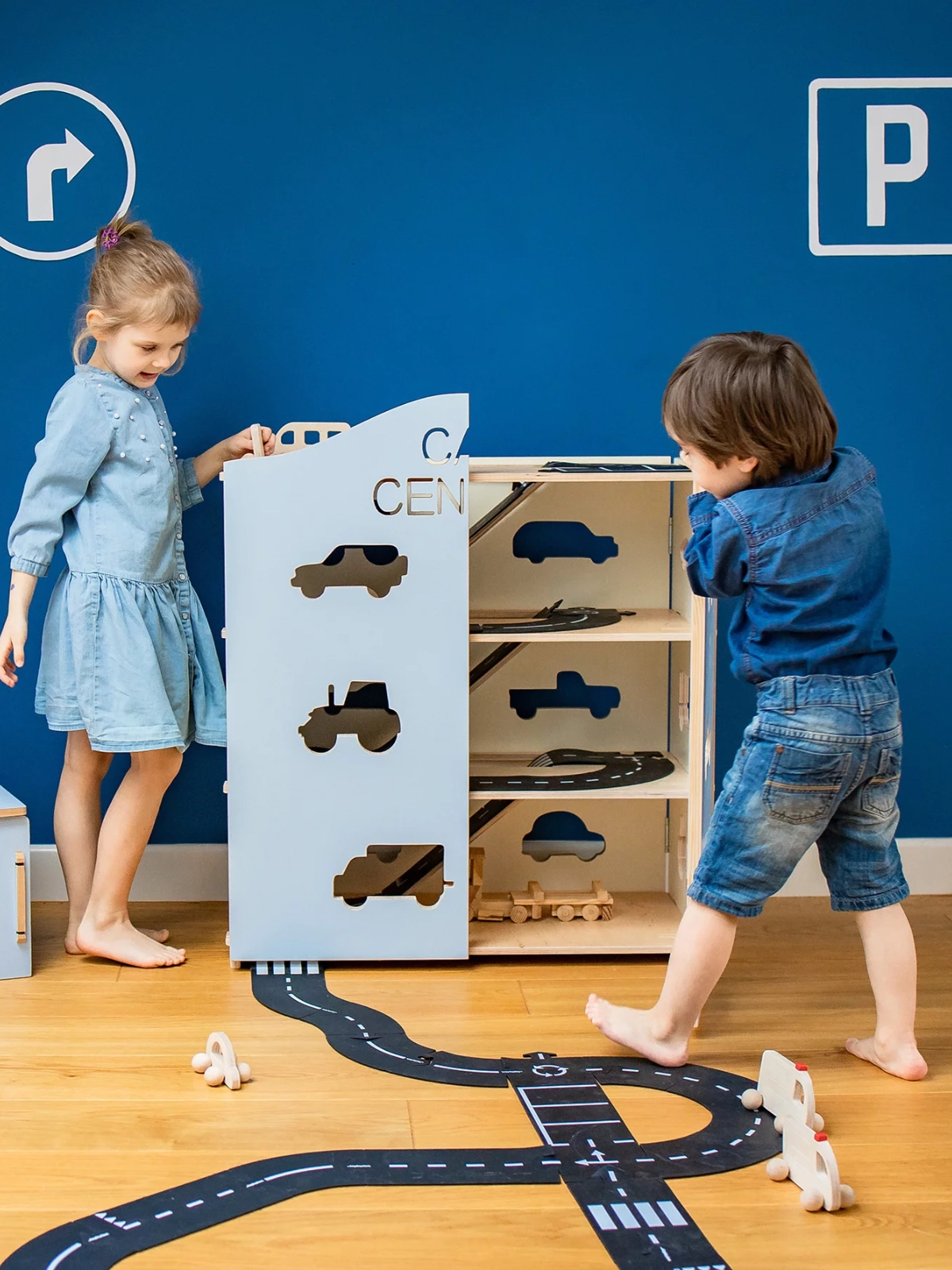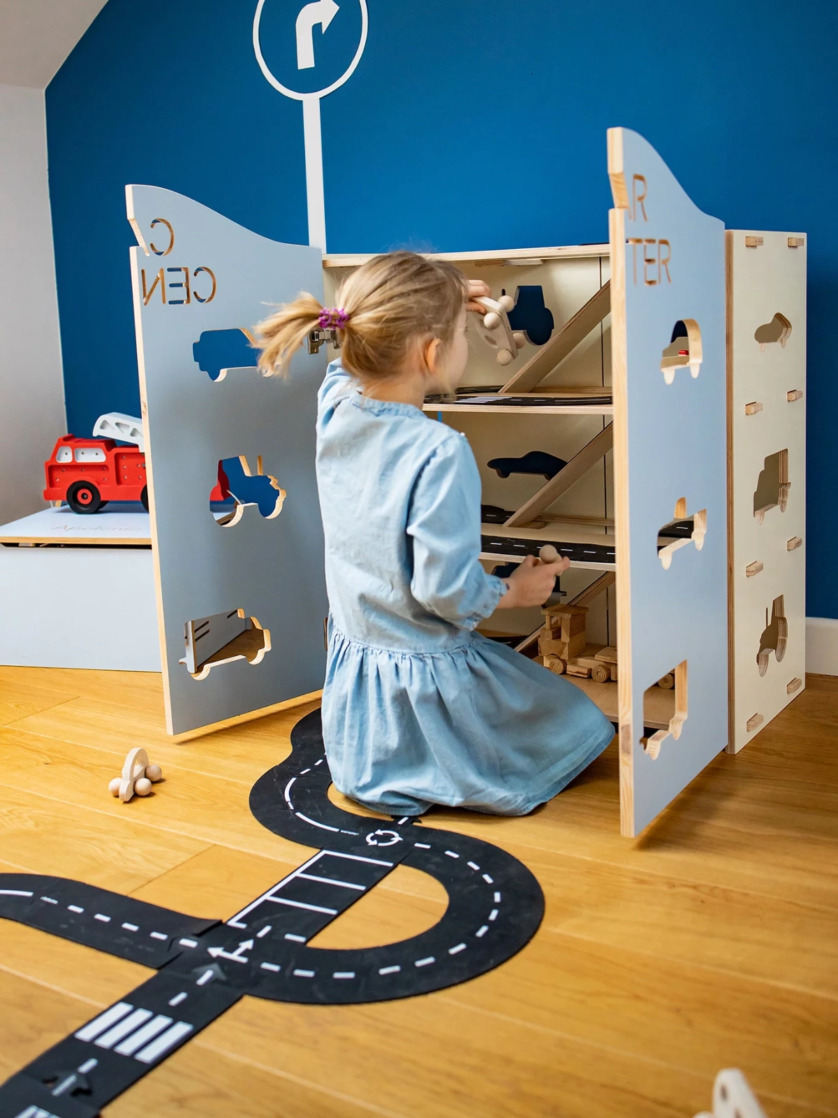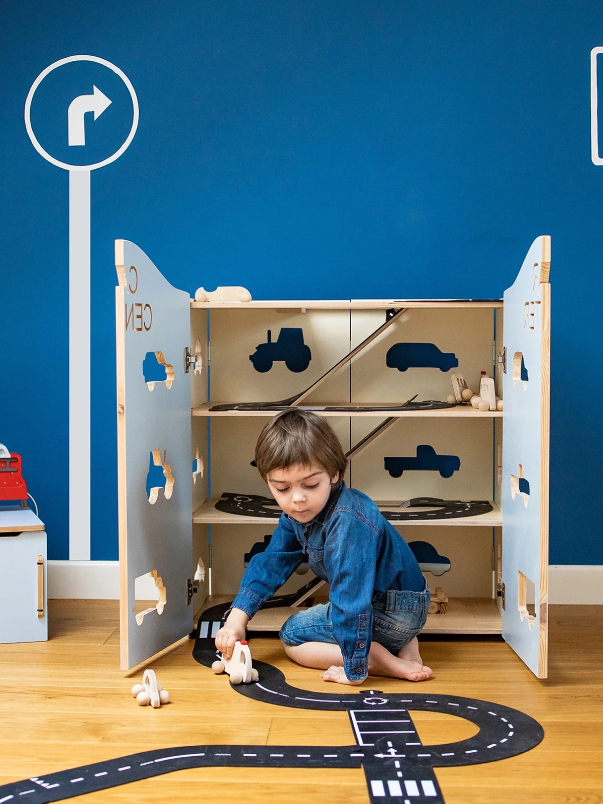 Das Kinderzimmer ist ein echtes Feld für logistische Fähigkeiten der Eltern. Wie kann man Platz für die notwendigen Möbel und anderen Gegenstände mit allen Spielsachen, Büchern und Plüschtieren unserer Kleinen finden? Wir haben uns selbst schon oft über solche Probleme Gedanken gemacht und deshalb versuchen wir, unsere Produkte so universell wie möglich zu gestalten. In einem Projekt sind verschiedene Verwendungszwecke und Funktionalitäten versteckt. Diesmal bieten wir eine Neuheit in Form eines Schranks an. Es geht aber nicht um ein gewöhnliches Möbelstück. Die Regale im Inneren können zur Aufbewahrung von Kleidung oder Büchern verwendet werden. Außerdem kann aber dieser Schrank auch zu einem richtigen, mehrstöckigen Parkhaus werden. Die Autos können zwischen den Plattformen dank einer speziellen Rutsche fahren, die jederzeit entfernt werden kann, um wieder einen Schrank zu schaffen.