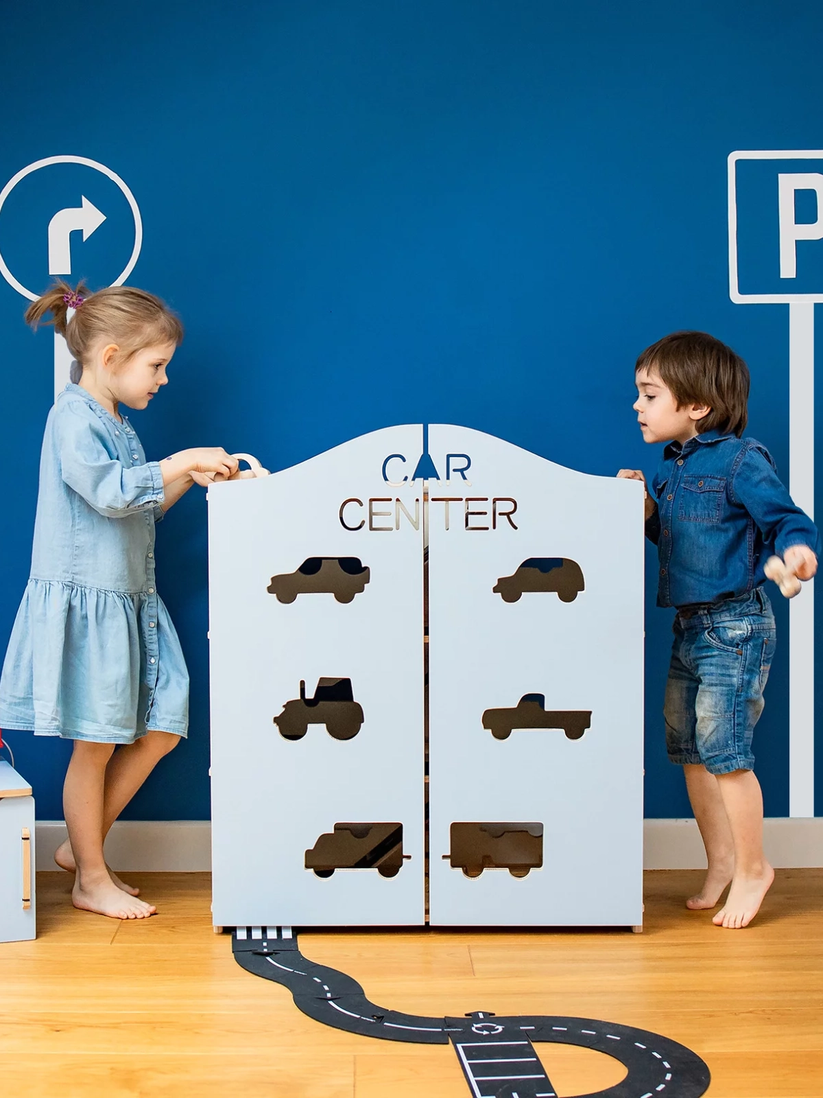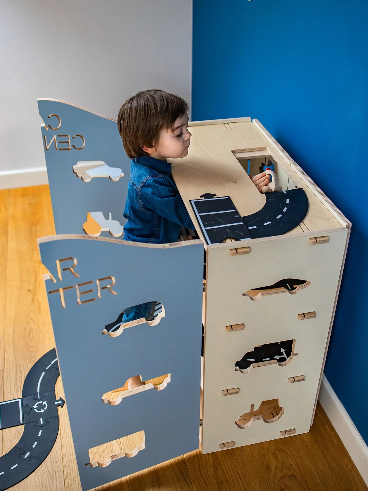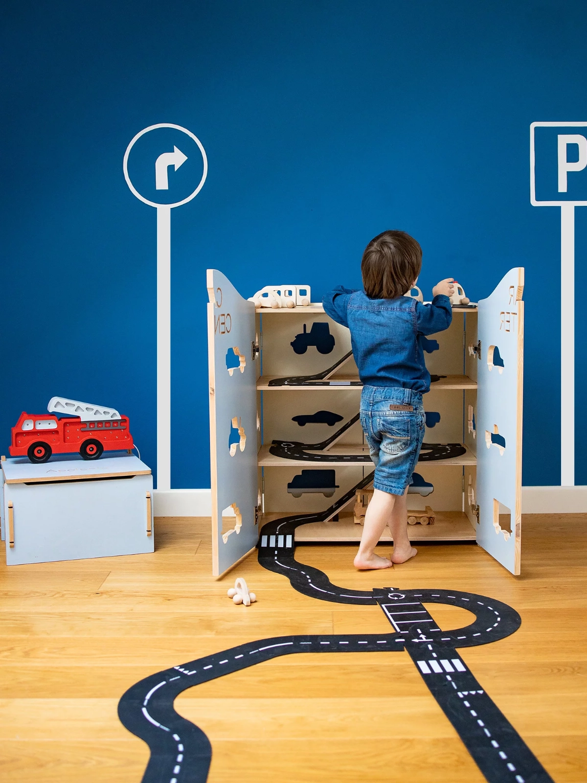 Das Kinderzimmer ist ein echtes Feld für logistische Fähigkeiten der Eltern. Wie kann man Platz für die notwendigen Möbel und anderen Gegenstände mit allen Spielsachen, Büchern und Plüschtieren unserer Kleinen finden? Wir haben uns selbst schon oft über solche Probleme Gedanken gemacht und deshalb versuchen wir, unsere Produkte so universell wie möglich zu gestalten. In einem Projekt sind verschiedene Verwendungszwecke und Funktionalitäten versteckt. Diesmal bieten wir eine Neuheit in Form eines Schranks an. Es geht aber nicht um ein gewöhnliches Möbelstück. Die Regale im Inneren können zur Aufbewahrung von Kleidung oder Büchern verwendet werden. Außerdem kann aber dieser Schrank auch zu einem richtigen, mehrstöckigen Parkhaus werden. Die Autos können zwischen den Plattformen dank einer speziellen Rutsche fahren, die jederzeit entfernt werden kann, um wieder einen Schrank zu schaffen.