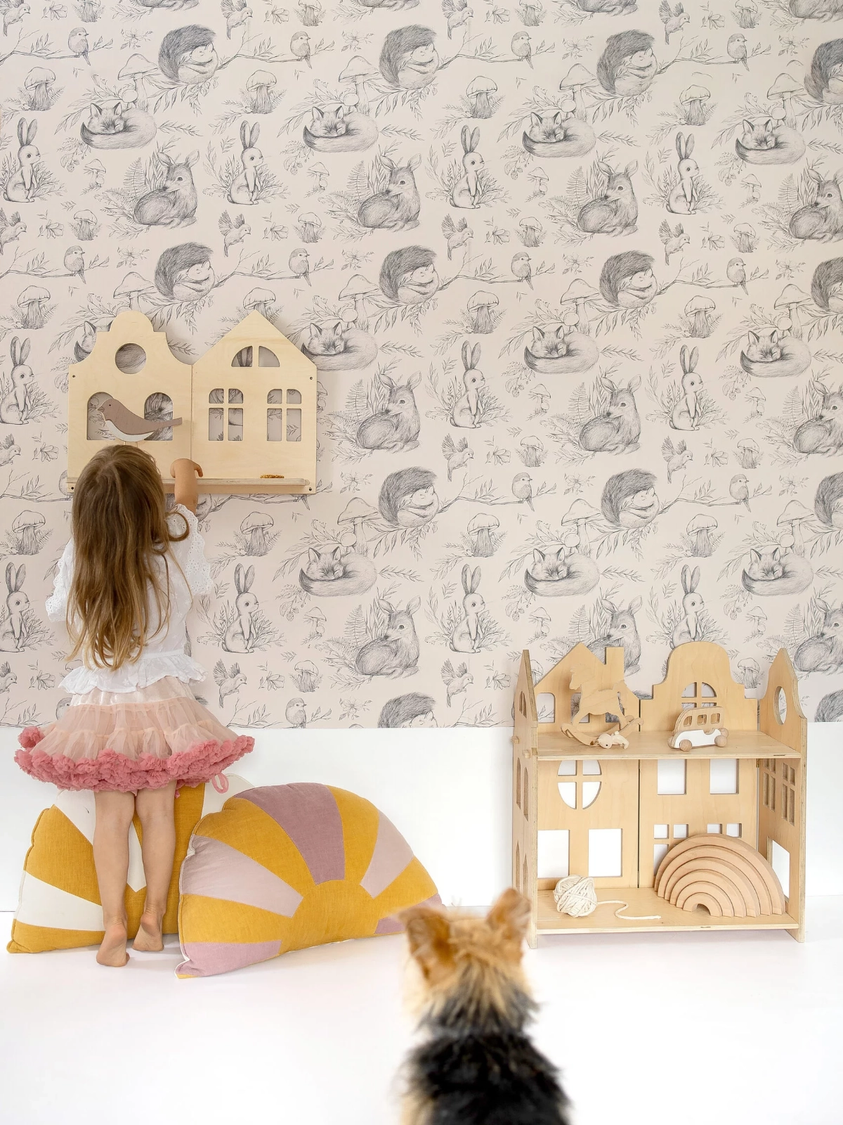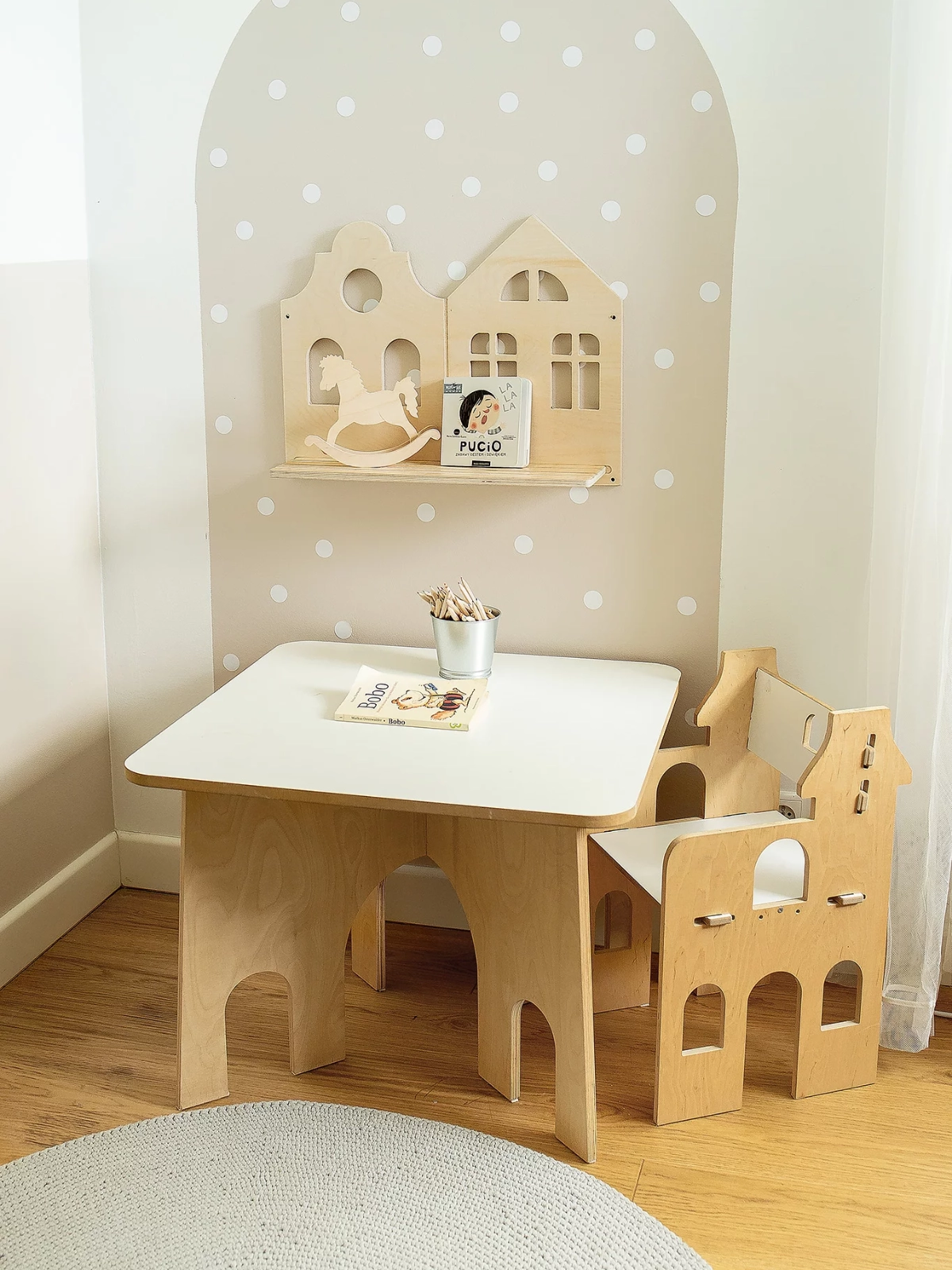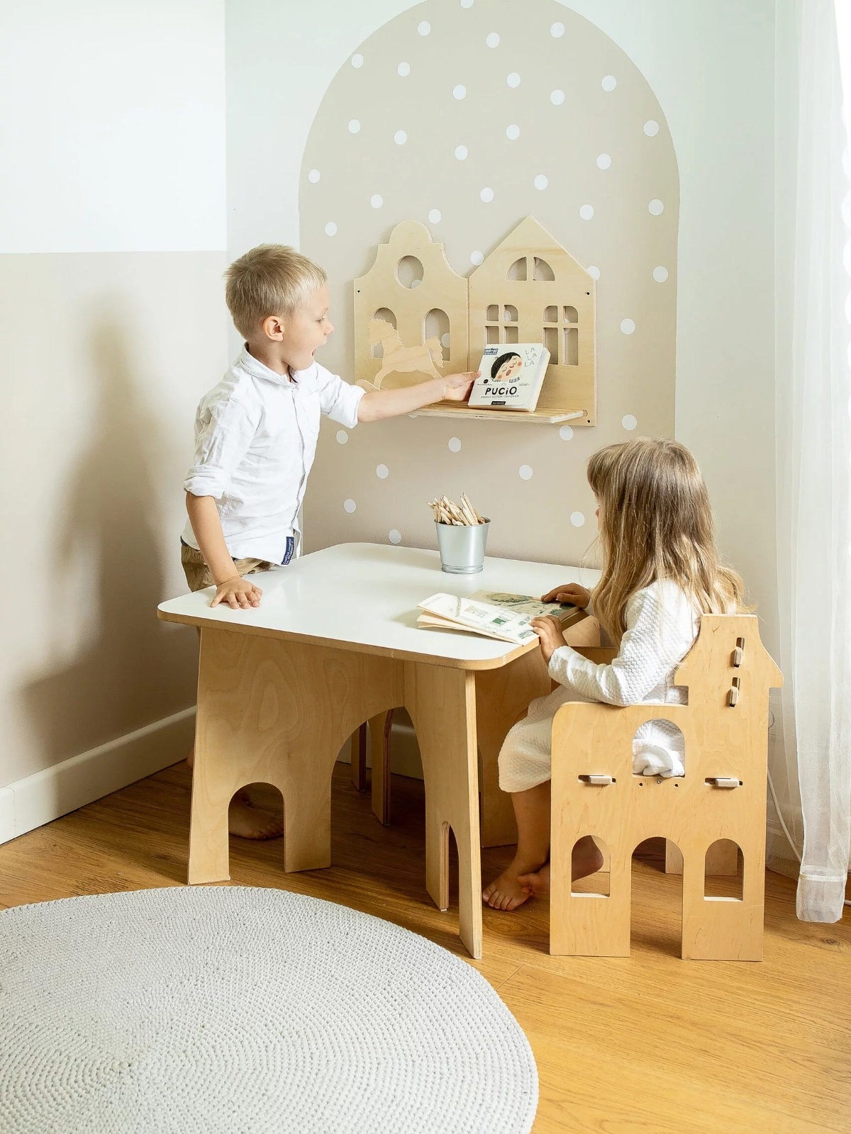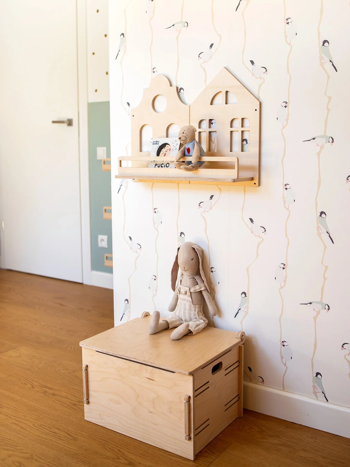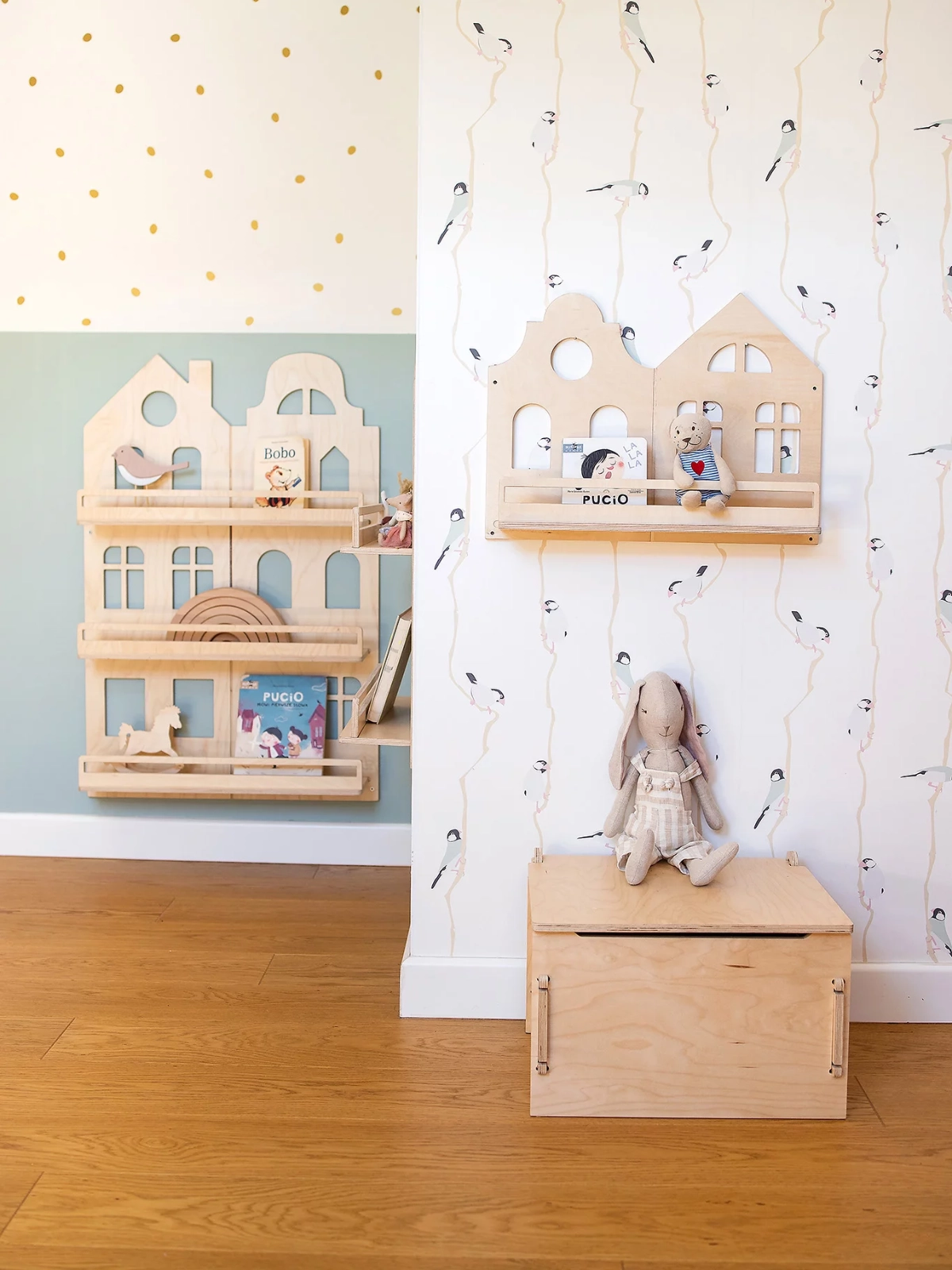 The bookshelf includes one shelf, making it a solid and durable piece of furniture. It is perfect for your child’s first library as it beautifully exposes the fronts of books, encouraging your child to read. Your child can quickly find their favorite book and reach for it freely. The bookshelf allows your child to easily access their favorite books, and it acts as an incentive for your child to read and develop his or her imagination. It also supports the development, creativity and independence of the future reader. The set consists of one wooden segment in the shape of tenement buildings. The facades of the buildings are divided by three diagonal planks that will hold your child’s treasures. The decorative elements are hand-worked and have no sharp edges. The furniture fits perfectly with all other My Mini Home products. The bookshelf is very versatile and it can be placed anywhere in a child’s room. The shelf is to be hung up on a wall using the 4 pins that are provided. The furniture can be ordered in pastel or natural wood colour, just like all other My Mini Home products.