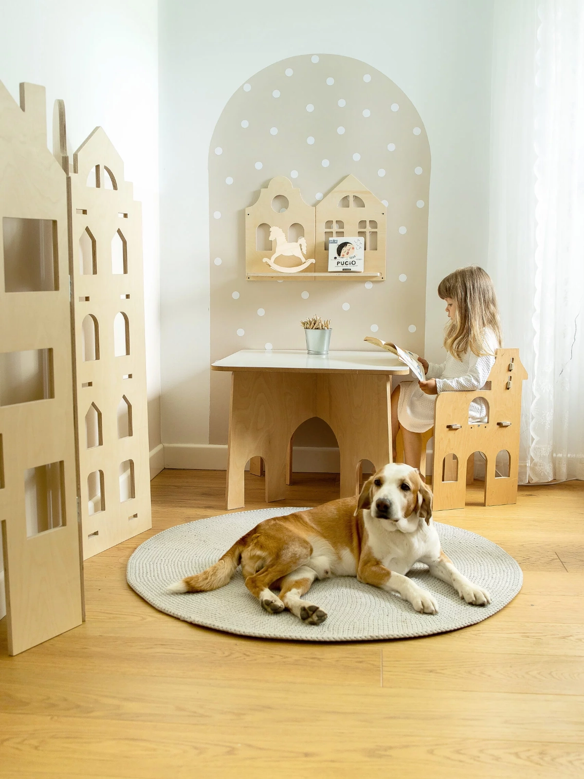 Our bookshelf is perfect for displaying your child’s favorite books and small treasures. All of their beloved fairy tales are easily accessible, right at their fingertips. Our bookshelf has the same design as the Multifunctional Screen. It can be mounted to the wall by using the supplied dowels.