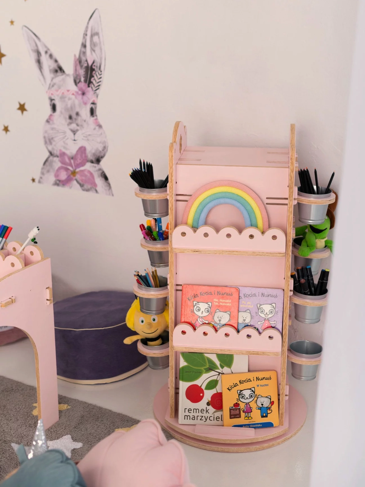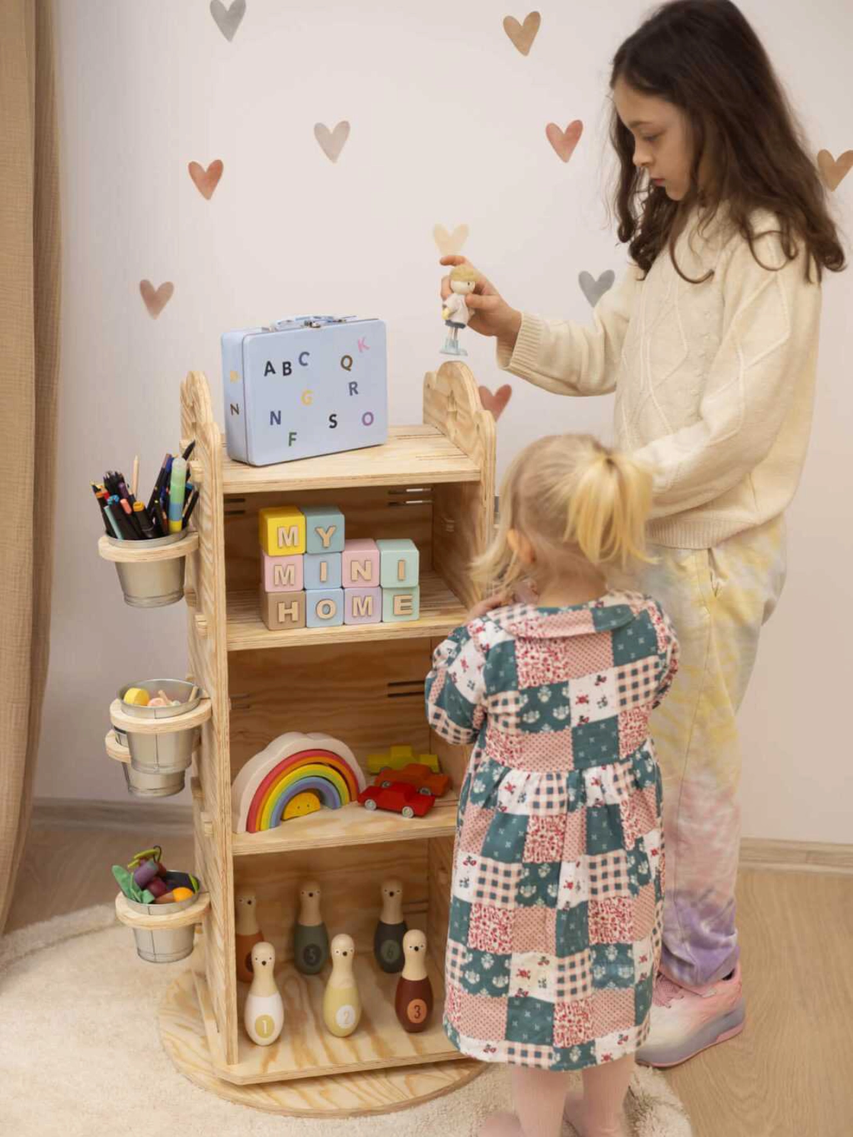 We like it when we come up with ideas that can turn something ordinary into something extraordinary. This is how we created a stand for a children’s space. It looks like an amazing house, the roof of which rises upwards, and inside, each floor hides children’s secrets. At the base we have included a system that allows you to turn the stand in any direction to find your treasure. On one side there are 3 deep shelves on which you can place various accessories and books. On two opposite sides there are wooden hoops serving as support for tin containers. They are an ideal place to hold drawing, painting or cutting accessories.