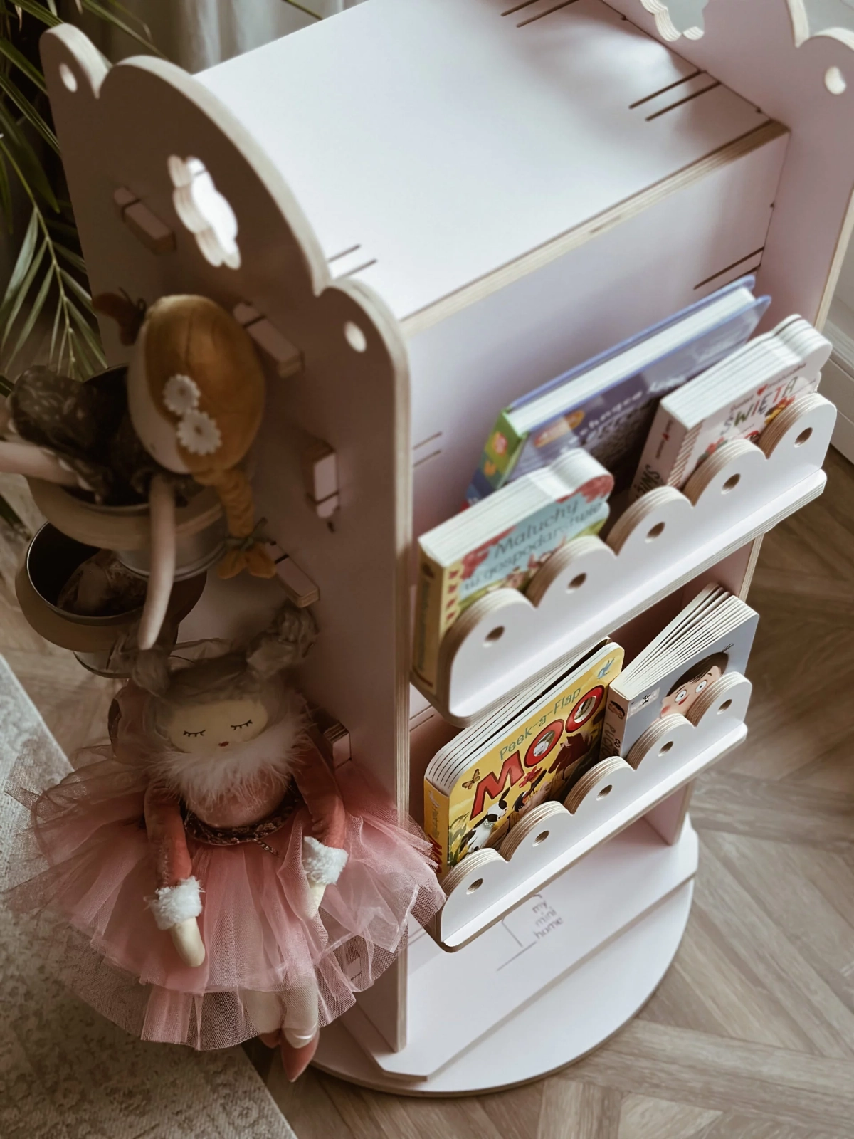 The 360 revolving shelf is the first piece of furniture from the Emma collection, and this name is not accidental. Emma is the youngest in Patrycja’s family, better known as MamaGang (@mamagang.pl). The history of this piece of furniture is also interesting, because it was not by accident that Patrycja and I completed a joint project in January 🙂 and what is January associated with in Poland? Of course, with WOŚP! The 360 revolving shelf from the Emma collection saw the light of day for the first time at the auction of the Great Orchestra of Christmas Charity. It was very popular and its auction value was almost twice as high as its market price.