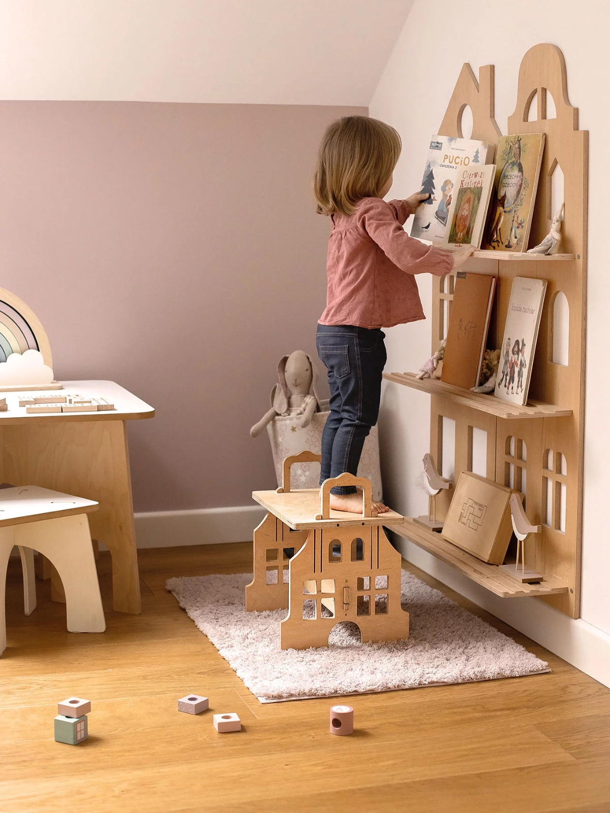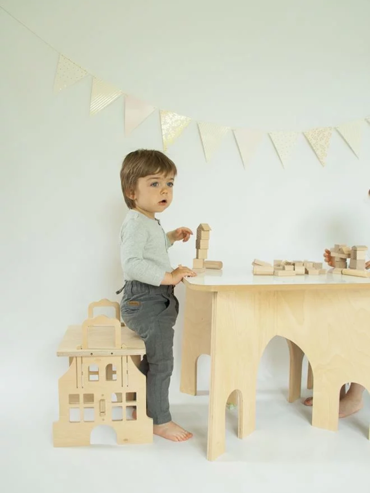 However, this child seat is not ordinary. This small step is also an original combination of a little stool with a slide for toys! Two slides are attached to it, which can be easily mounted thanks to wooden dowels. Each of them is placed on the width of each of the handles. On one side, a tiny vehicle can drive up to the top of the step, and then slide down on the other side.