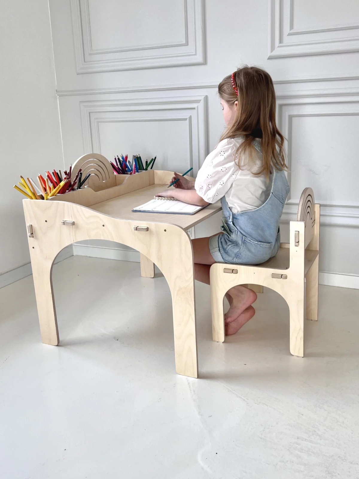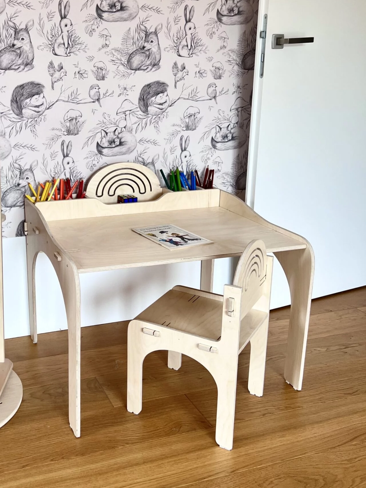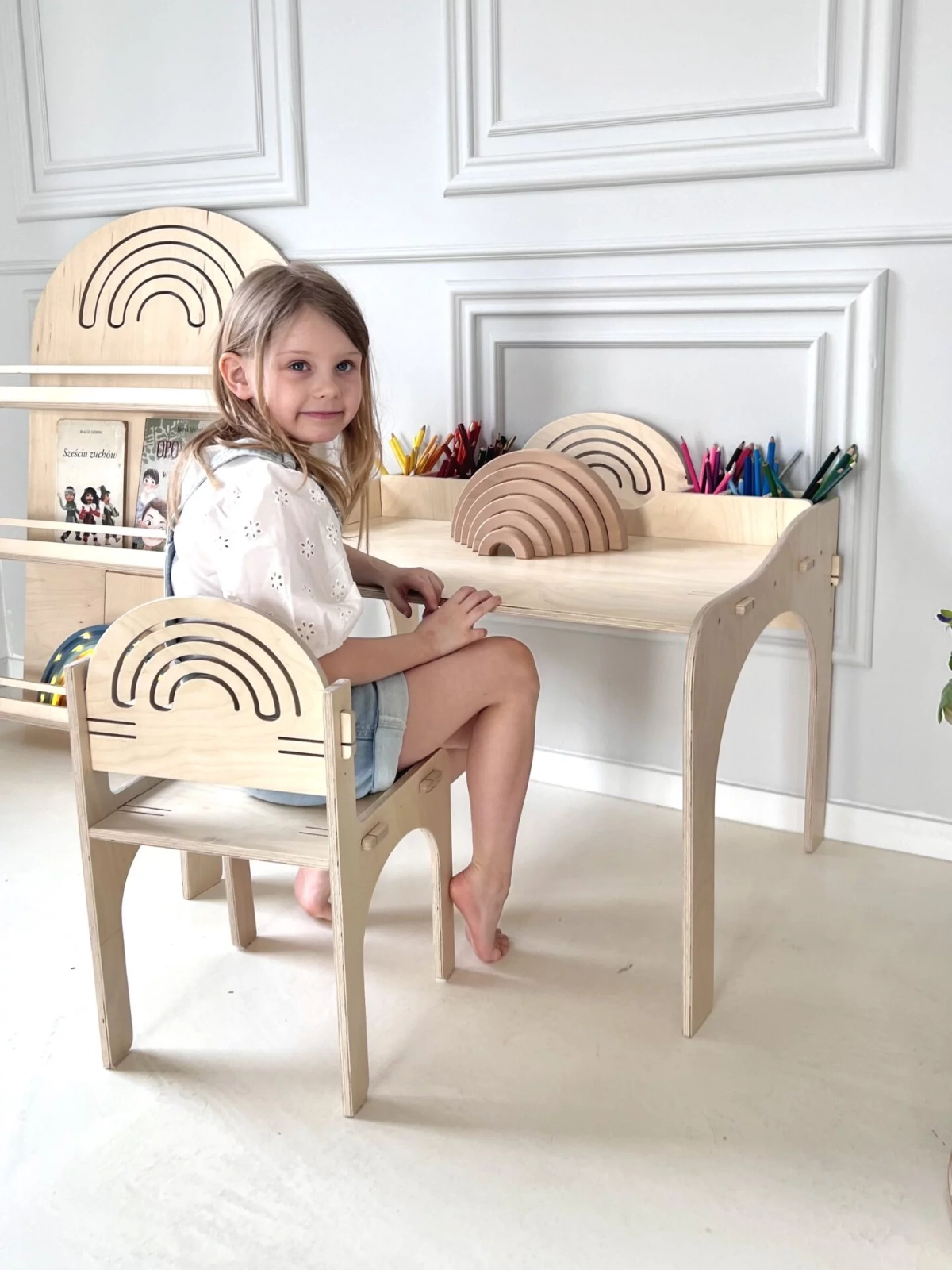 The Rainbow children’s chair forms a set with the The Rainbow desk. What they have in common is integral design and workmanship. This set will make a place for creative activities, crazy experiments or quiet learning more attractive.