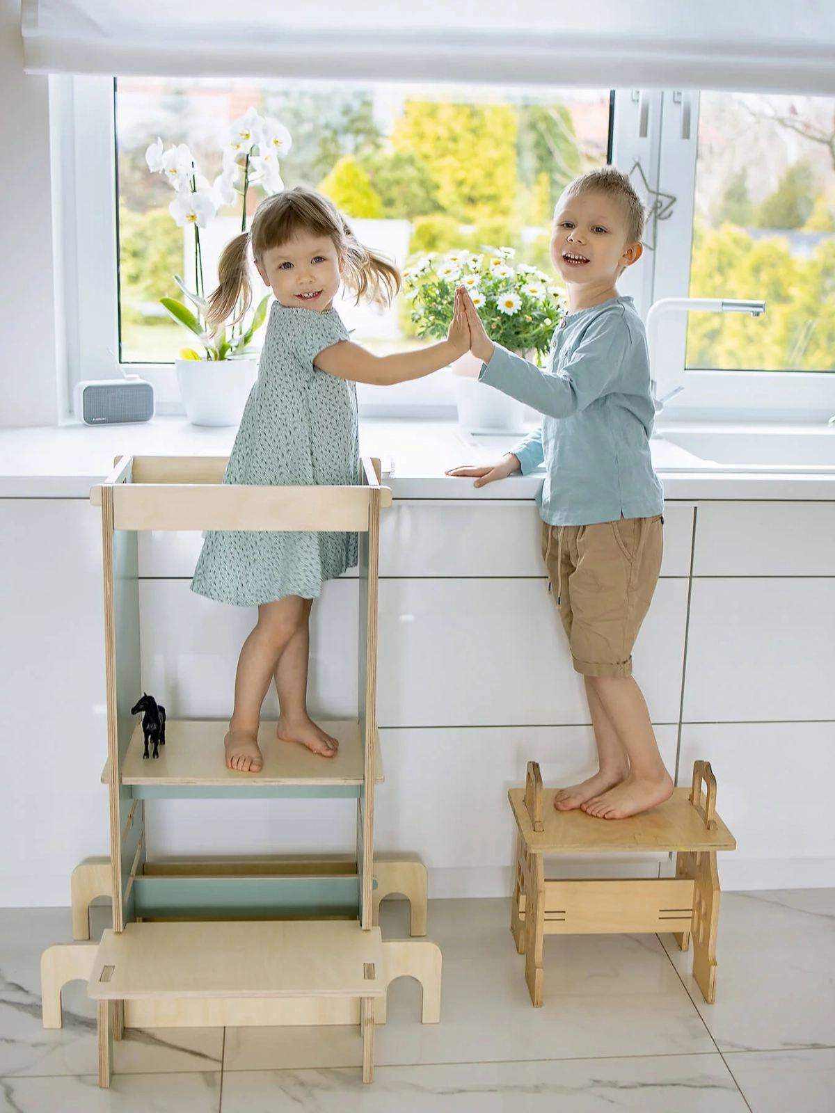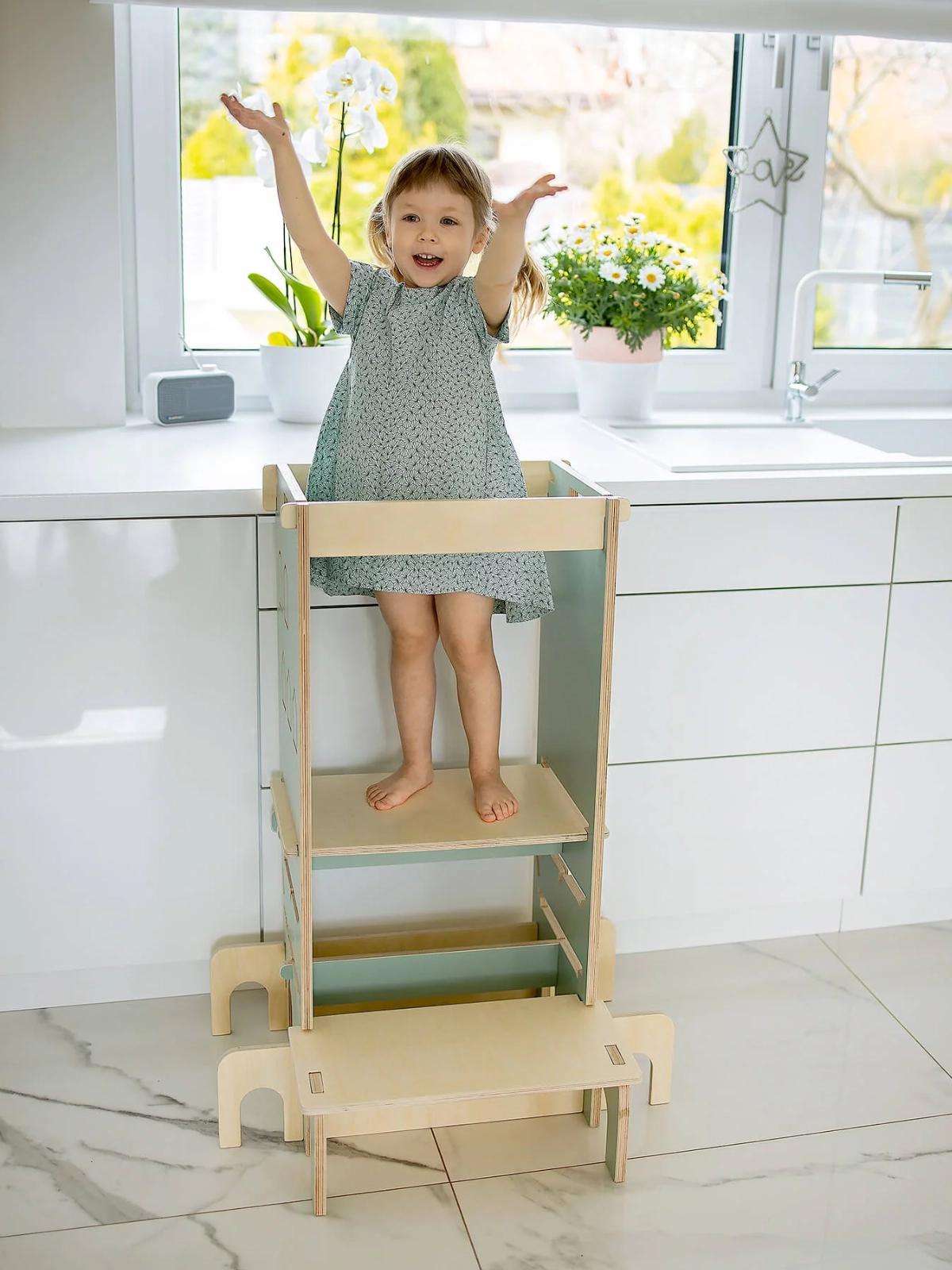 Kitchen helper, znany również pod nazwą learning tower, jest specjalnym drewnianym meblem, ułatwiającym dziecku asystowanie przy pracach w kuchni. Można go dostawić do dowolnej części mebli, od blatu po zlew. Własne, podwyższone stanowisko do pracy sprawia, że dziecko od najmłodszych lat wprawia się w arkana sztuki kulinarnej. Obserwuje i naśladuje czynności dorosłych, ucząc się układania na talerzu, mycia warzyw, mieszania składników lub ugniatania ciasta. Kitchen helper świetnie nadaje się również do spożywania posiłków. Dziecko, które odkryło frajdę z chodzenia, chętnie jada w pozycji stojącej.