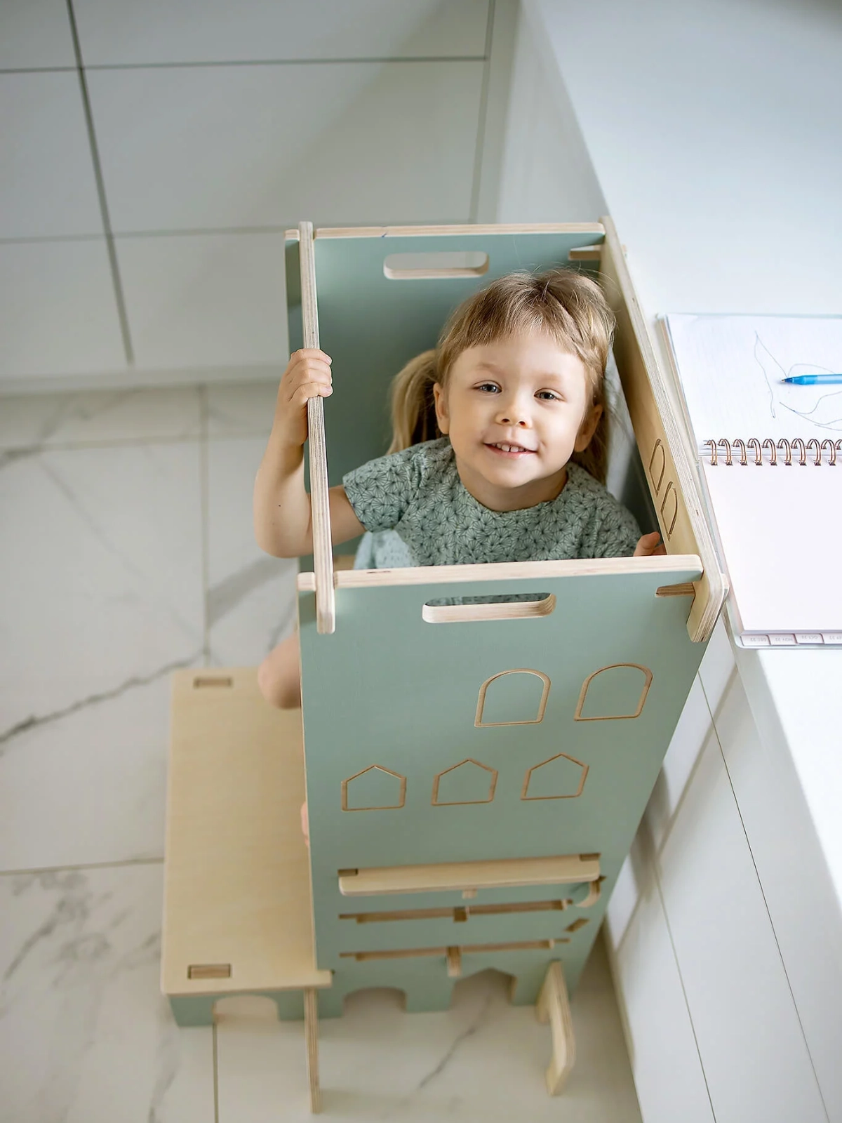 Mebel jest przeznaczony dla dziecka, które opanowało chodzenie. Wejście do środka ułatwia niewielki schodek. Zabezpieczony podest posiada trzy regulacje wysokości. Mebel rośnie więc wraz z jego użytkownikiem. Można go wykorzystać jako zjeżdżalnię dzięki dodatkowej płycie, dostępnej w zestawie. Jej wysokość stabilizuje się na dwóch poziomach. Ze względu na dekoracyjność kitchen helpera, nadaje się on także do zabaw w teatrzyk. Learning tower jest przeznaczony do samodzielnego montażu przy wykorzystaniu specjalnie wyprofilowanych otworów. Jego boki wykonano z liściastej sklejki o 15 mm grubości, natomiast poprzeczki, stopień, podest, poprzeczka do teatrzyku to sklejka 12 mm. Zjeżdżalnia to laminowana płyta MDF. Zasłonki w gwiazdki są w komplecie.