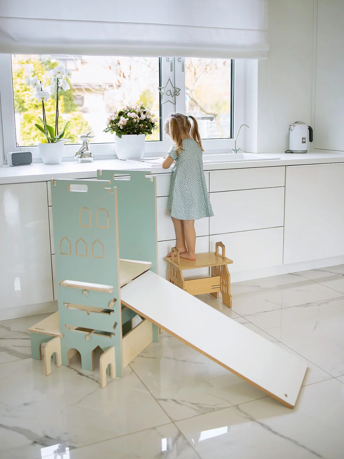 Kitchen helper to rodzaj zabezpieczonego podestu, który umożliwia dziecku uczestniczenie w wielu kuchennych czynnościach. Dzięki niemu maluch nie tylko widzi, co dzieje się przy blacie roboczym. Może również sięgać po różne produkty i próbować swoich sił w przygotowywaniu posiłku. Mebel posiada także funkcję zjeżdżalni oraz teatrzyku.