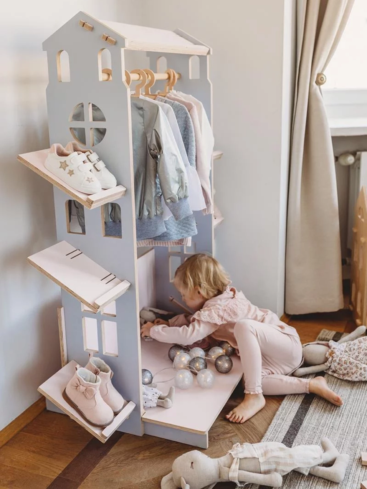 Mini Garderoba to doskonały pomysł na pierwszy mebel na dziecięce tekstylia. Może stać się ważną pomocą w edukowaniu malucha w temacie kompletowania codziennych zestawów ubrań oraz odwieszaniu ich na właściwe miejsce. Świetnie sprawdzi się w pokoju dziecięcym, może stanąć także obok “dorosłej” garderoby w przedpokoju. Estetyka idealnie komponuje się z pozostałymi pomysłami z kolekcji My Mini Home. Identyczny jest również sposób montażu, który nie wymaga stosowania dodatkowych narzędzi.