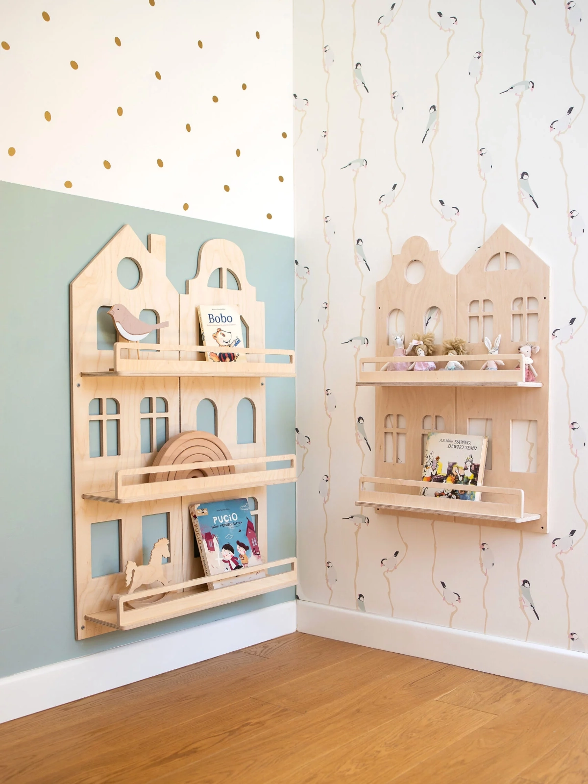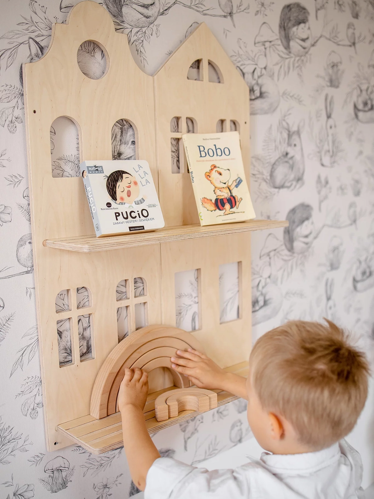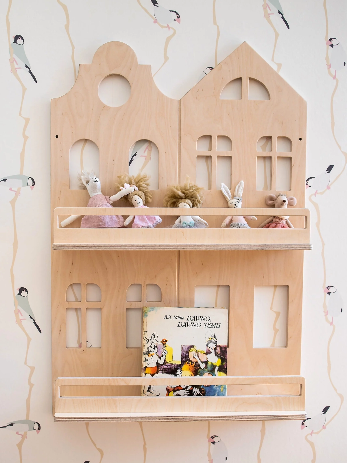 Potrójna półka na książki to solidny i wytrzymały mebel, idealny na pierwszą biblioteczkę dziecka. Pięknie eksponuje fronty książek, zachęcając do zapoznania się z zawartością. Ich ustawienie sprawia, że maluch szybko odnajdzie ulubiony tytuł i swobodnie do niego dotrze. Łatwość wykładania i wkładania książek stanowi zachętę dla dziecka do częstszego obcowania ze słowem pisanym. Półka wpisuje się w filozofię bezpiecznych mebli, wspierających rozwój, kreatywność i samodzielność przyszłego czytelnika. Całość składa się z dwóch drewnianych segmentów w kształcie kamienic. Ich stylistyka nawiązuje do linii pozostałych mebli My Mini Home. Fronty budynków przecinają trzy poprzeczne deski, podtrzymujące dziecięce bibeloty. Elementy dekoracyjne są ręcznie obrabiane i nie posiadają ostrych krawędzi.
