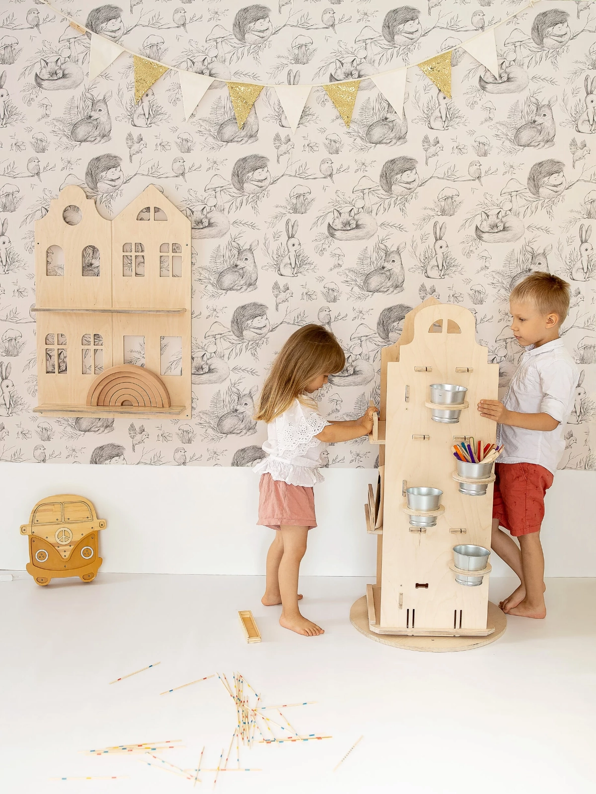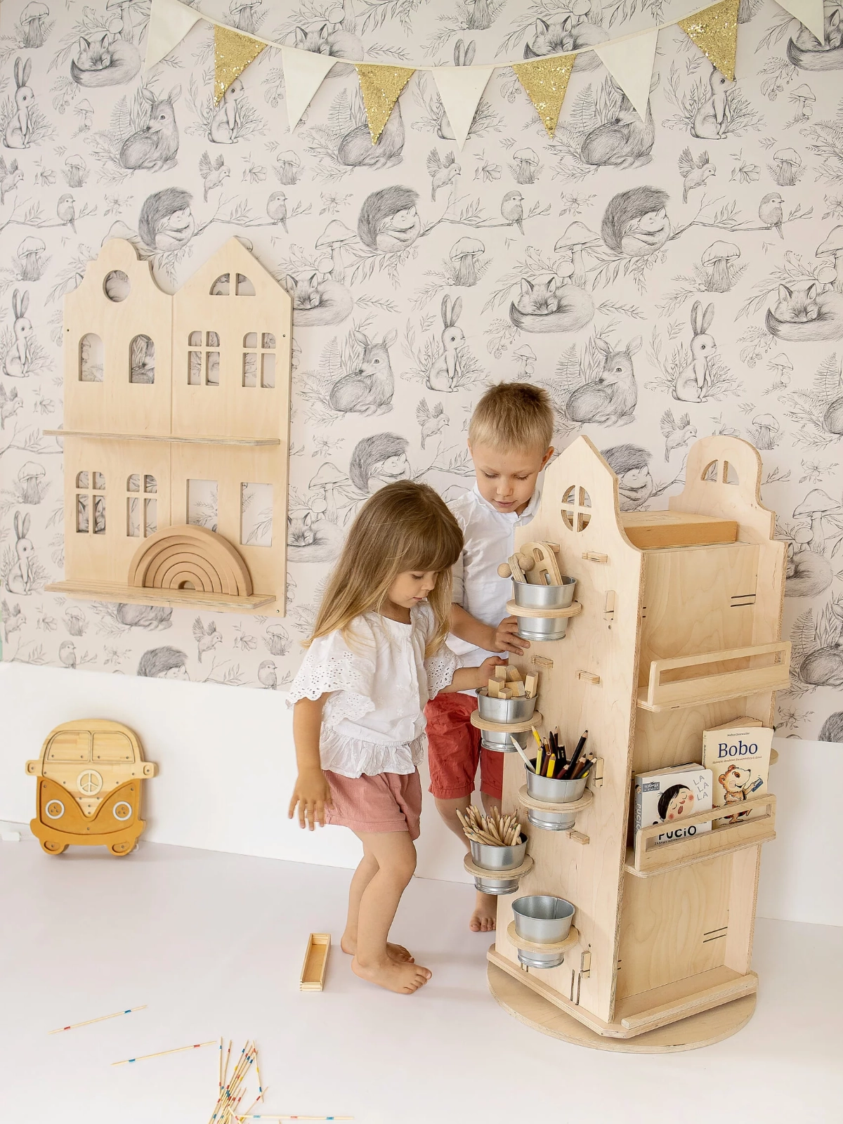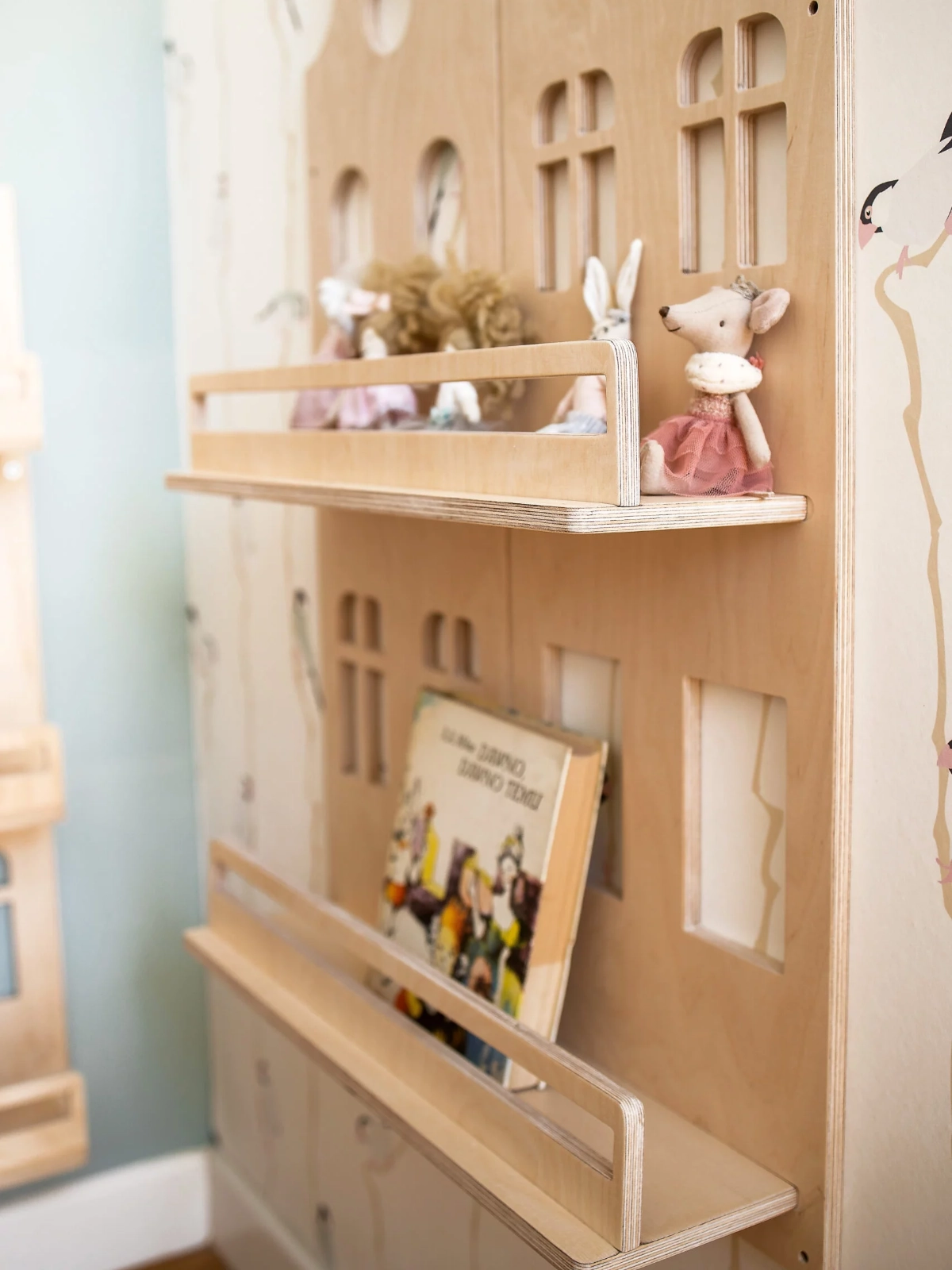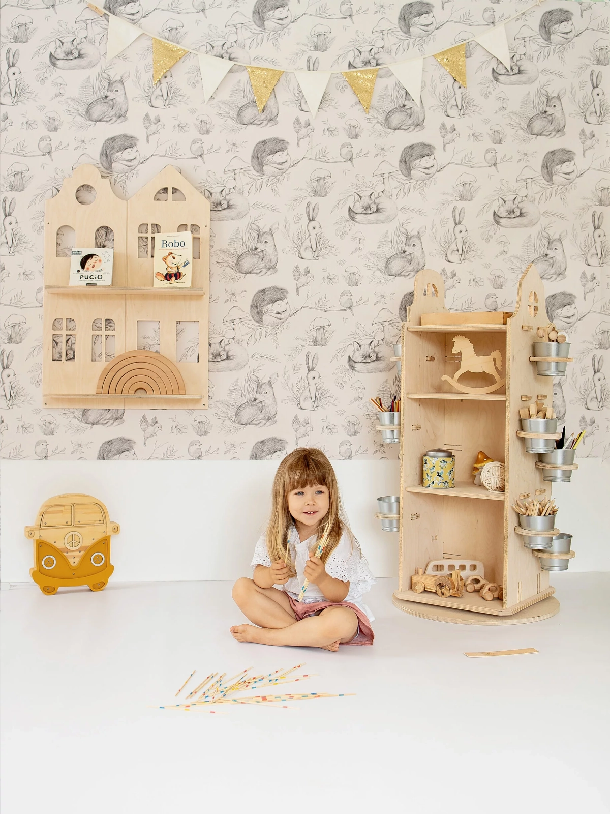 Potrójna półka na książki to solidny i wytrzymały mebel, idealny na pierwszą biblioteczkę dziecka. Pięknie eksponuje fronty książek, zachęcając do zapoznania się z zawartością. Ich ustawienie sprawia, że maluch szybko odnajdzie ulubiony tytuł i swobodnie do niego dotrze. Łatwość wykładania i wkładania książek stanowi zachętę dla dziecka do częstszego obcowania ze słowem pisanym. Półka wpisuje się w filozofię bezpiecznych mebli, wspierających rozwój, kreatywność i samodzielność przyszłego czytelnika. Całość składa się z dwóch drewnianych segmentów w kształcie kamienic. Ich stylistyka nawiązuje do linii pozostałych mebli My Mini Home. Fronty budynków przecinają trzy poprzeczne deski, podtrzymujące dziecięce bibeloty. Elementy dekoracyjne są ręcznie obrabiane i nie posiadają ostrych krawędzi.